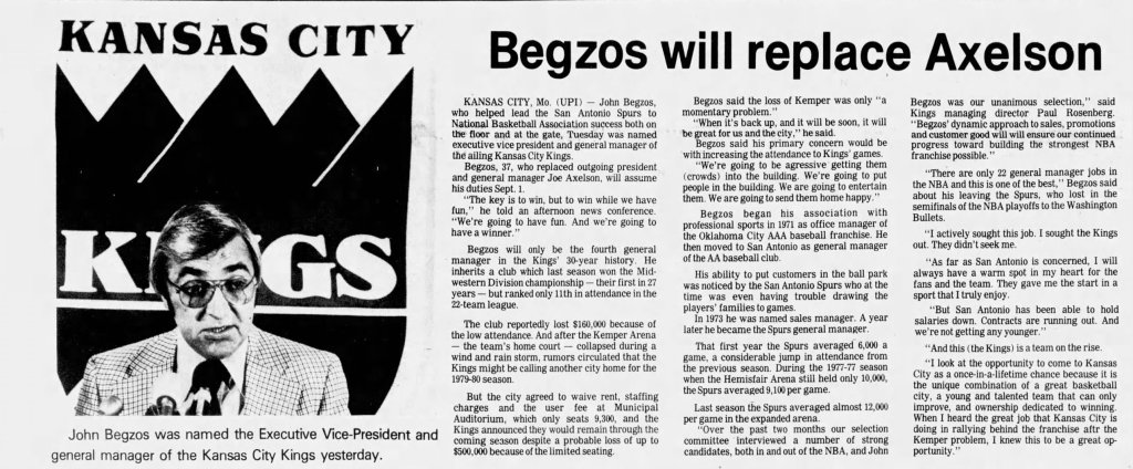 Was Begzos too independent? Too ambitious? Did he alienate ownership or certain shareholders? Were his methods too borderline? Beyond the stamp affair, hardly a crime of the century, nothing particularly negative ever emerged about his management, either in San Antonio or Kansas City. He was described as authoritarian, but well within the norms of NBA front offices at the time.