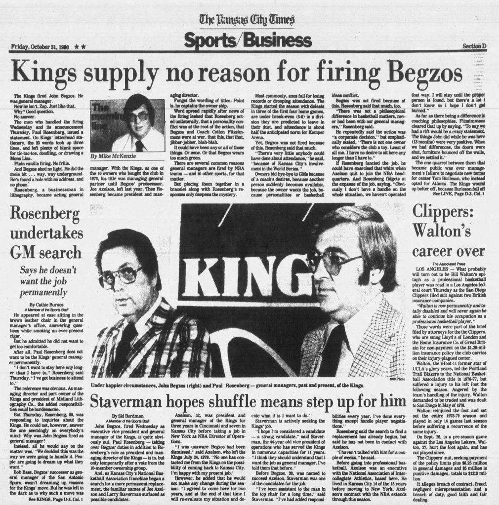 In late October 1980, just days before the new NBA season tips off, the news breaks. John Begzos has been fired. The official statement gives no reason. Asked by the Kansas City Times, team president Paul Rosenberg Jr. deflects. “It’s neither a personality issue nor a basketball issue.”