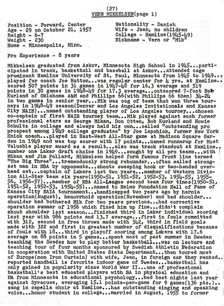 But NBA history enthusiasts will stop here, because Mikkelsen was one of the league’s first true strongmen. The perfect lieutenant to George Mikan with the Minneapolis Lakers, a four time NBA champion, six time All Star, and widely considered the very first power forward in league history, long before the term itself existed.